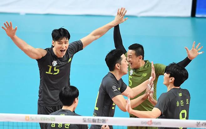 (서울=연합뉴스) 부상에서 복귀한 문성민(왼쪽) 등 현대캐피탈 선수들이 20일 서울 중구 장충체육관에서 열린 프로배구 우리카드와의 경기에서 기뻐하고 있다. 2021.1.20 [한국배구연맹 제공. 재배포 및 DB 금지]