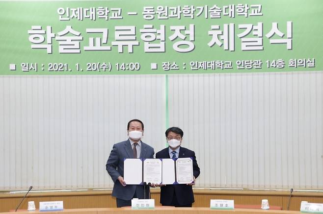 인제대학교(총장 전민현)는 20일 인제대 인당관 14층 회의실에서 동원과학기술대학교(총장 손영우)와 학술교류협정을 체결했다.