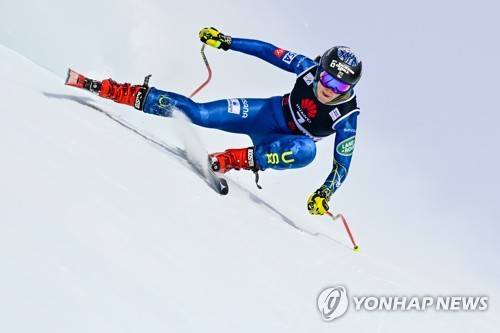 epa08951454 Breezy Johnson of the United States in action during a training session for the women's Downhill race at the FIS Alpine Skiing World Cup in Crans-Montana, Switzerland, 20 January 2021. EPA/JEAN-CHRISTOPHE BOTT