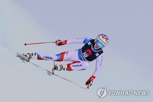 epa08951459 Michelle Gisin of Switzerland in action during a training session for the women's Downhill race at the FIS Alpine Skiing World Cup in Crans-Montana, Switzerland, 20 January 2021. EPA/JEAN-CHRISTOPHE BOTT