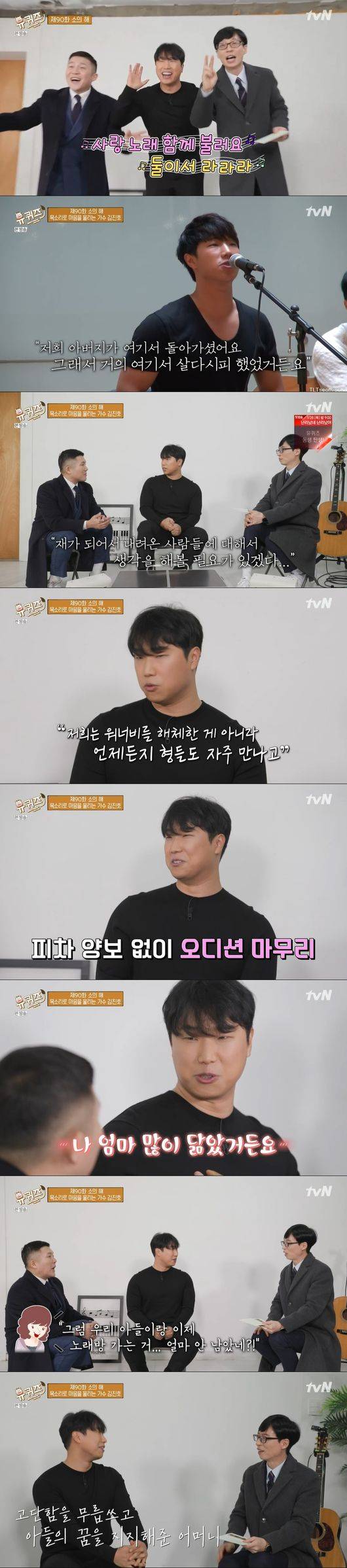 김진호는 "중2때 아버지가 돌아가시고 어머니와 노래방에서 노래로 슬픔을 달래는 것이 취미, 그 날 노래들으며 행복해하셨다, 이후 두달 동안 연락이 없다가 오디션 합격 소식을 들었다"고 말해 눈길을 끌었다.