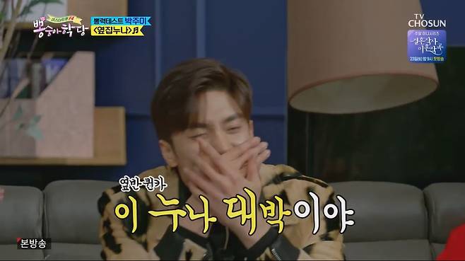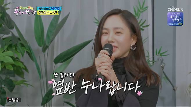 '뽕숭아학당' 출연 소식에 가족들의 응원을 받았다는 박주미는 "시어머니 임영웅 씨의 팬이고 아들은 붐 씨를 너무 좋아한다"면서 아들이 추천한 붐의 노래 '옆집 누나'를 선곡했다. 박주미는 열정 넘치는 댄스를 선보여 폭소케했다.