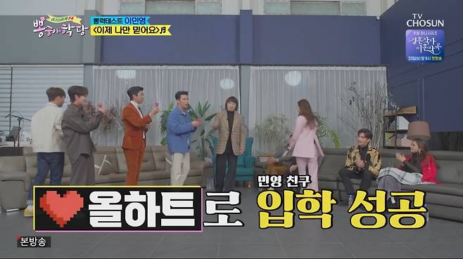 이에 장민호는 "내가 그럴 줄 알았다. 기승전-히어로가 공식 수순"이라며 투덜거렸다. 임영웅은 떨리는 목소리로 노래하는 이민영을 도와 훈훈한 듀엣을 완성했다. 그리고 트롯맨들의 '올하트'를 받아 뽕반 입학에 성공했다.