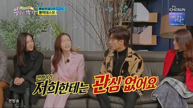 한편 이민영은 "뽕반에 들어가고 싶다"면서 눈을 반짝였다. 이를 본 성훈은 "저희한테는 관심이 없는데, 남 얘기 이렇게 오래하는 걸 처음 봤다"고 폭로했다. 전노민 또한 "말은 할 줄 알았구나"라며 "현장에서 워낙 말을 안 한다"고 증언했다.