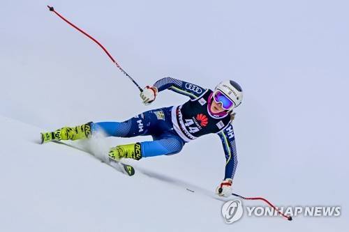 epa08951575 Lin Ivarsson of Sweden in action during a training session for the women's Downhill race at the FIS Alpine Skiing World Cup in Crans-Montana, Switzerland, 20 January 2021. EPA/JEAN-CHRISTOPHE BOTT