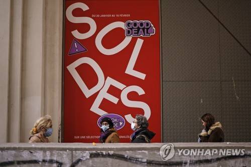 epa08951584 Pedestrians walk past sale signs on shop windows in Paris, France, 20 January 2021. Winter sales will take place from 20 January to 16 February 2021. EPA/YOAN VALAT