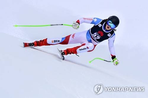 epa08951619 Stephanie Jenal of Switzerland in action during a training session for the women's Downhill race at the FIS Alpine Skiing World Cup in Crans-Montana, Switzerland, 20 January 2021. EPA/JEAN-CHRISTOPHE BOTT