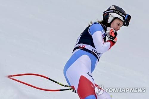 epa08951632 Rahel Kopp of Switzerland reacts during a training session for the women's Downhill race at the FIS Alpine Skiing World Cup in Crans-Montana, Switzerland, 20 January 2021. EPA/JEAN-CHRISTOPHE BOTT