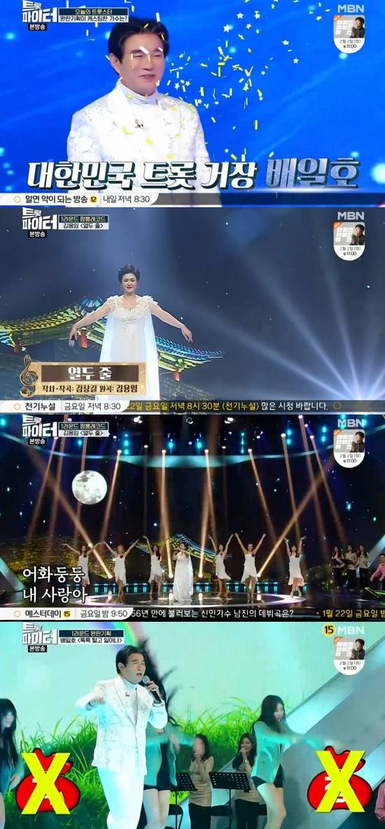 이날 1라운드에서 ‘완판기획’의 배일호와 ‘짬뽕레코드’의 김용임이 트로트 대결을 펼쳤다.