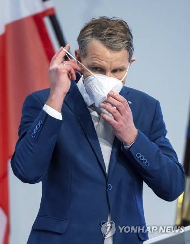 Far-right politician Bjoern Hoecke, Thuringia's AfD parliamentary group leader, walks to his seat wearing an FFP-2 mask at the special plenary session of the Thuringia state parliament on lockdown rules. The special session was requested by the AfD parliamentary group. (Michael Reichel/dpa via AP)