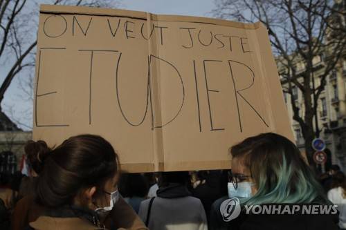 Students demonstrate, one with a poster reading "We just want to learn", Wednesday, Jan. 20, 2021 in Paris. French university students protested Wednesday on Paris' Left Bank to demand to be allowed back to class, and to call attention to suicides and financial troubles among students cut off from friends, professors and job opportunities amid the pandemic. (AP Photo/Christophe Ena)