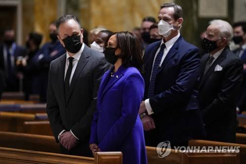 Doug Emhoff looks at his wife Vice President-elect Kamala Harris as they attend Mass at the Cathedral of St. Matthew the Apostle during Inauguration Day ceremonies Wednesday, Jan. 20, 2021, in Washington. (AP Photo/Evan Vucci)