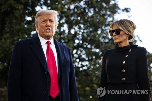 epa08951675 US President Donald J. Trump (L) and First Lady Melania Trump exit the White House for the last time before boarding Marine One on the South Lawn, on the morning of Joe Biden's Presidential inauguration, in Washington, DC, USA, 20 January 2021. Joe Biden won the 03 November 2020 election to become the 46th President of the United States of America. EPA/AL DRAGO / POOL