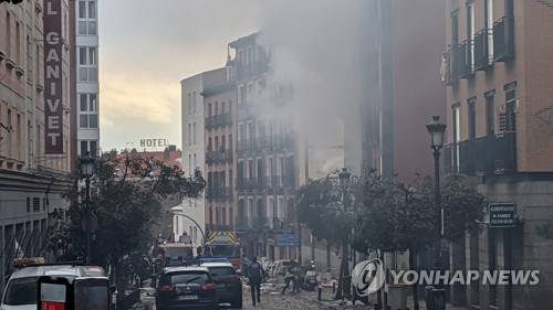 A strong explosion causes the collapse of part of a building in Madrid