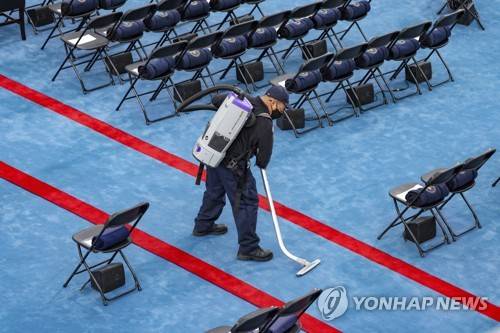 A worker vacuums as preparations are made ahead of President-elect Joe Biden's inauguration ceremony, Wednesday, Jan. 20, 2021, in Washington. (Tasos Katopodis/Pool Photo via AP) POOL PHOTO