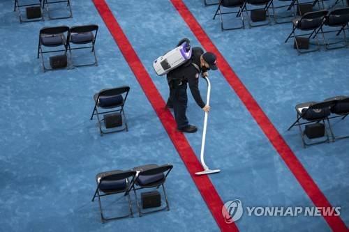 epa08951730 An Architect of the Capitol worker vacuums the Inaugural platform prior to the inauguration of Joe Biden as US President in Washington, DC, USA, 20 January 2021. Biden won the 03 November 2020 election to become the 46th President of the United States of America. EPA/CAROLINE BREHMAN / POOL