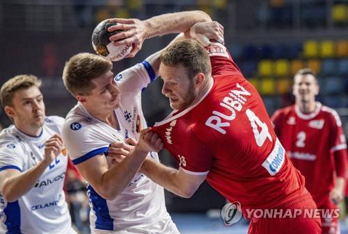 epa08951741 Switzerland's Lenny Rubin (R) in action against Viggo Kristjansson of Iceland during the match between Switzerland and Iceland at the 27th Men's Handball World Championship in Cairo, Egypt, 20 January 2021. EPA/URS FLUEELER