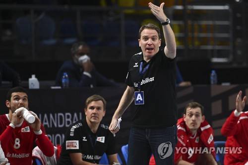 epa08951743 Switzerland's head coach Michael Suter reacts during the main round match between Switzerland and Iceland at the 27th Men's Handball World Championship in Cairo, Egypt, 20 January 2021. EPA/Anne-Christine Poujoulat / POOL