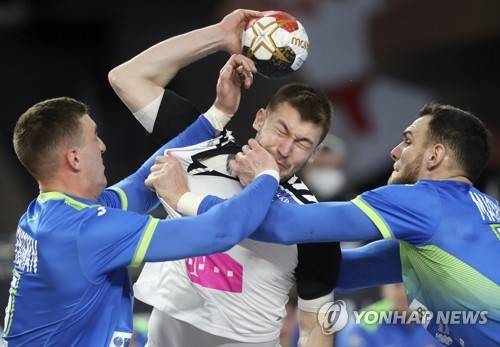 epa08951745 Goran Krstevski (C) of North Macedonia in action against Borut Mackovsek (R) of Slovenia during the match between North Macedonia and Slovenia at the 27th Men's Handball World Championship in Cairo, Egypt, 20 January 2021. EPA/Mohamed Abd El Ghany / POOL