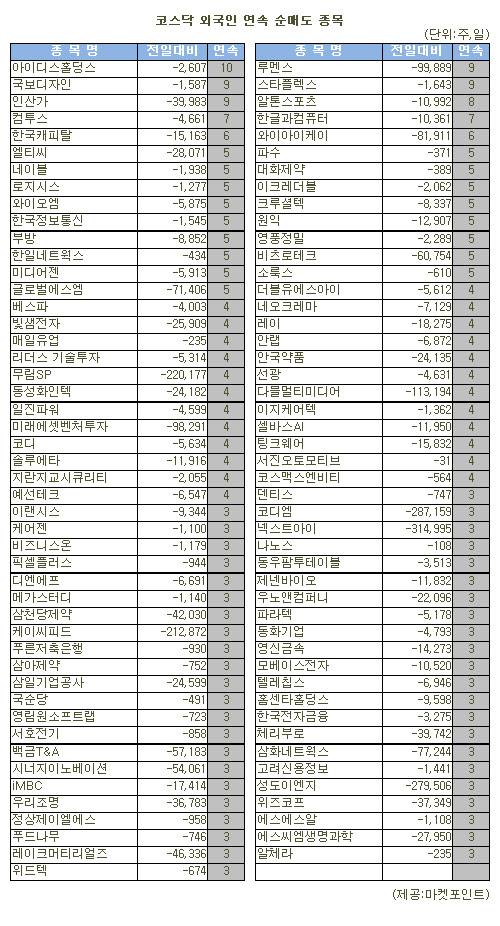 [표]코스닥 외국인 연속 순매도 종목(20일)