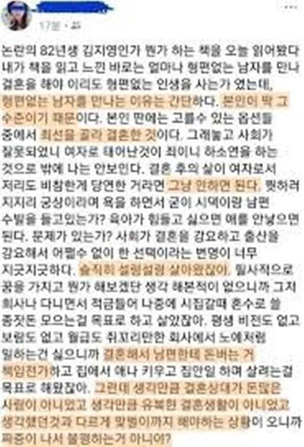 이러한 가운데 BJ'감동란이 과거 작성한 것으로 추정되는 게시글이 각종 커뮤니티에 올라와 화제를 모으고 있다. 해당 게시글은 '82년생 김지영' 책을 읽고 소감을 적은 내용들이었다.
