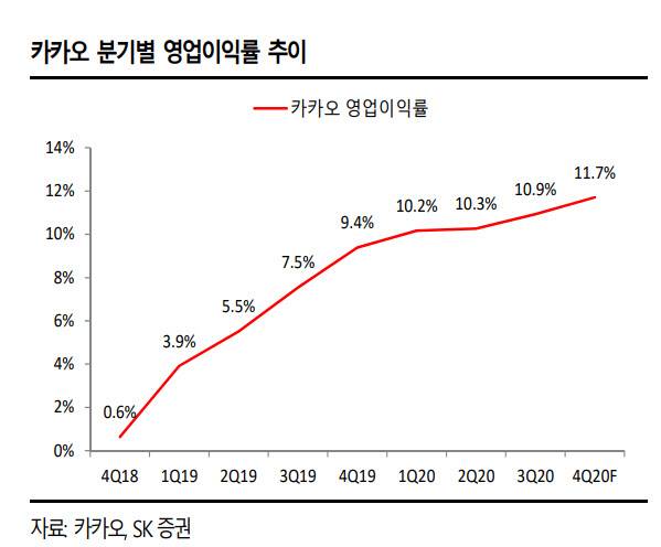 이어 “영업이익률은 11.7%로 예상되는데 2018년 4분기 이후 매분기 이어진 영업이익률 상향추세가 이어질 것”이라며 “2021년에도 카카오 수익성개선 추세가 이어질 전망”이라고 내다봤다.