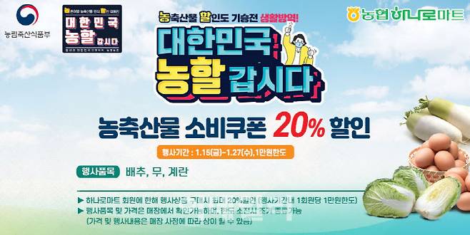 농협 하나로마트가 농림축산식품부에서 주관하는 '농할(농산물 할인)갑시다' 행사에 동참하여 오는 27일까지 전국 2,300여개 하나로마트 매장에서 계란, 무, 배추 등 3개 품목을 할인 판매한다.