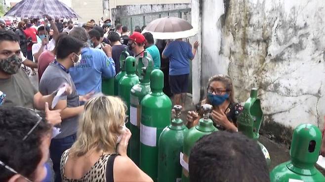 브라질 북서부 아마조나스주입니다. 한 공장 앞이 어른 어깨까지 오는 거대한 산소탱크를 짊어진 사람들로 인산인해입니다. 무더운 날씨에도 줄은 좀처럼 줄어들지 않았습니다.