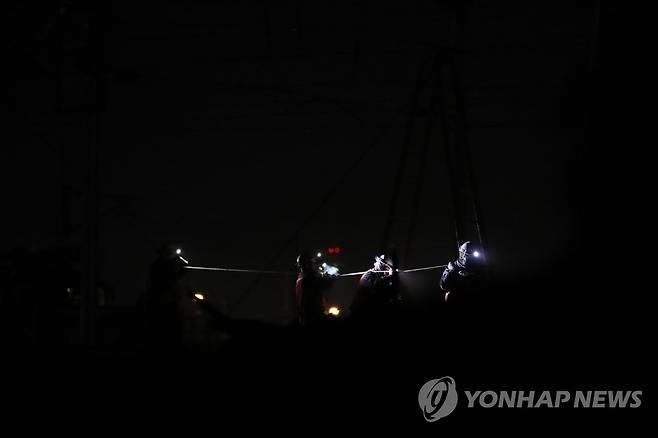 (울산=연합뉴스) 박동주 기자 = 21일 오전 울산 태화강역 인근 동해 남부선 선로에서 전차선 노동자들이 급전선 가선 작업을 하고 있다.