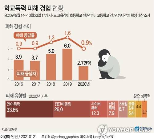 (서울=연합뉴스) 김영은 기자 = 교육부는 17개 시·도 교육감이 초등학교 4학년부터 고등학교 2학년까지 전체 학생을 대상으로 지난해 9월 14일부터 10월 23일까지 실시한 '2020년 학교폭력 실태조사(전수조사)' 결과를 21일 발표했다.
