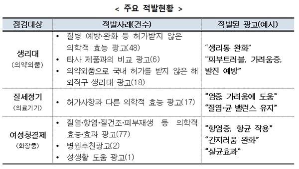 이번에 적발된 허위‧과대광고 제품은 ▲의약외품인 생리대 72건 ▲의료기기인 ‘질세정기’ 17건 ▲화장품인 ‘여성청결제’ 80건 등이다.