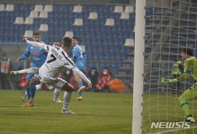 [레조에밀리아=AP/뉴시스]유벤투스의 크리스티아누 호날두가 20일(현지시간) 이탈리아 레조 에밀리아의 마페이 경기장에서 열린 이탈리아 슈퍼컵(수페르코파 이탈리아나) 나폴리와의 경기 후반 19분 선제골을 넣고 있다. 유벤투스는 호날두의 선제 결승 골과 알바로 모라타의 쐐기 골로 나폴리를 2-0으로 물리치고 정상에 올라 통산 9번째 슈퍼컵 우승을 차지했다. 이탈리아 슈퍼컵은 직전 시즌 세리에A 챔피언과 이탈리아 컵(코파 이탈리아) 우승팀이 맞붙는다. 2021.01.21.