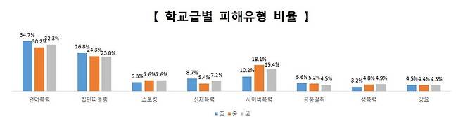 다만 예년에 견줘볼 때, 여러 학교폭력 피해유형 가운데 '집단따돌림'과 '사이버폭력'만 비중이 커진 현상이 눈에 띈다.