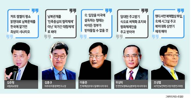북미대화 복원을 위한 대미소통 전략도 의견이 갈렸다. 위 전 대사와 이용준 전 대사, 김흥규 교수는 북한 비핵화 방법론에 대해 한미가 의견을 같이해야 한다는 데에 방점을 뒀다. 이 전 대사는 “중재를 하려면 중립적이어야 한다”며 “지난 2017~2018년 회담에서 우리 정부가 보여준 건 의제 10개 중 8~9개는 북한의 입장을 미국에 설득하는 형태였다. 비핵화 절차와 원칙을 중시할 바이든 정부 입장에서는 받아들일 수 없는 접근”이라고 꼬집었다.