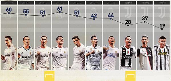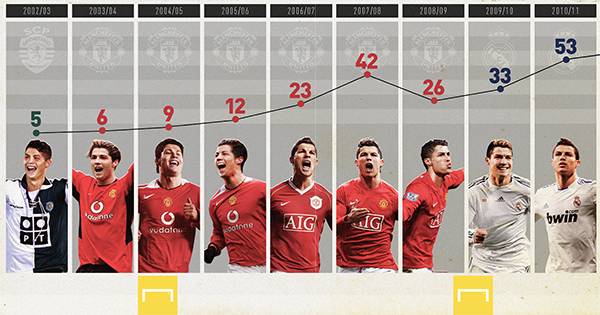 그렇다면 프로 데뷔 이후 호날두의 시즌별 득점 일지는 어떨까? 그래픽을 통해 알아보겠다.