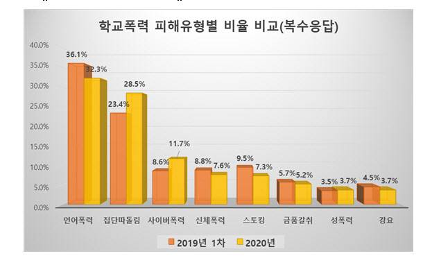 피해유형별로 학생 천 명당 피해응답 건수는 언어폭력(5.7건), 집단따돌림(5.0건), 사이버폭력(2.1건) 등의 순으로 나타났다. 유형별 비율은 언어폭력(32.3%), 집단따돌림(28.5%), 사이버폭력(11.7%), 신체폭력(7.6%), 스토킹(7.3%) 순으로 파악됐다.