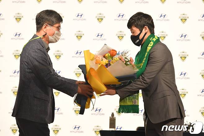 (서울=뉴스1) = 박지성이 21일 오전 경기도 고양 현대모터스튜디오에서 열린 '전북현대 클럽 어드바이저 위촉 기자회견'에서 백승권 단장으로부터 축하 꽃다발을 받고 있다. (전북 현대 제공) 2021.1.21/뉴스1
