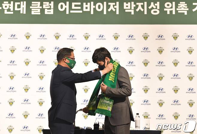 (서울=뉴스1) = 박지성이 21일 오전 경기도 고양 현대모터스튜디오에서 열린 '전북현대 클럽 어드바이저 위촉 기자회견'에서 허병길 대표이사로 부터 머플러를 받고 있다. (전북 현대 제공) 2021.1.21/뉴스1