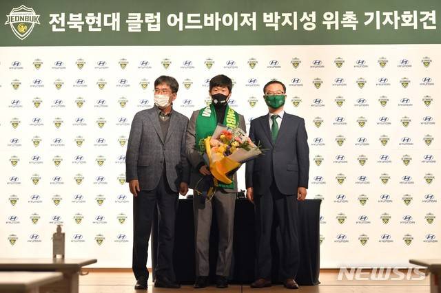 [서울=뉴시스]한국 축구 전설 박지성(가운데)이 21일 경기도 고양 현대모터스튜디오에서 열린 '전북 현대 클럽 어드바이저 취임 기자회견'에 참석해 백승권(왼쪽) 단장, 허병길 대표이사와 기념촬영 하고 있다. 박지성은 전북 현대에서 프로와 유소년 선수 선발, 육성 및 스카우트, 훈련 시스템 제시 등에 대한 조언자 역할을 맡는다. 2021.01.21. (사진=전북 현대 제공) photo@newsis.com