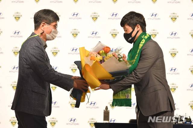 [서울=뉴시스]한국 축구 전설 박지성이 21일 경기도 고양 현대모터스튜디오에서 열린 '전북 현대 클럽 어드바이저 취임 기자회견'에 참석해 전북현대 백승권 단장에게 꽃다발을 전달받고 있다. 박지성은 전북 현대에서 프로와 유소년 선수 선발, 육성 및 스카우트, 훈련 시스템 제시 등에 대한 조언자 역할을 맡는다. 2021.01.21. (사진=전북 현대 제공) photo@newsis.com