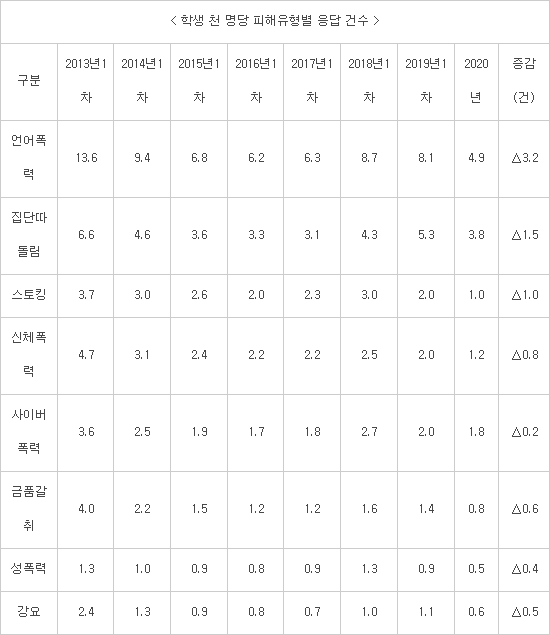 학생 명당 피해유형 응답 건수는 지난해보다 모든 피해유형에서 감소했으며, 언어폭력(4.9건), 집단따돌림(3.8건), 사이버폭력(1.8건) 순으로 나타났다.