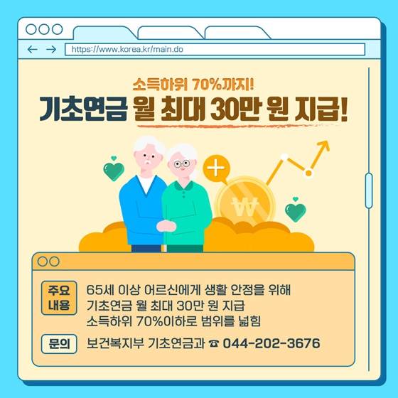 ·소득하위 70%까지! 기초연금 월 최대 30만 원 지급!