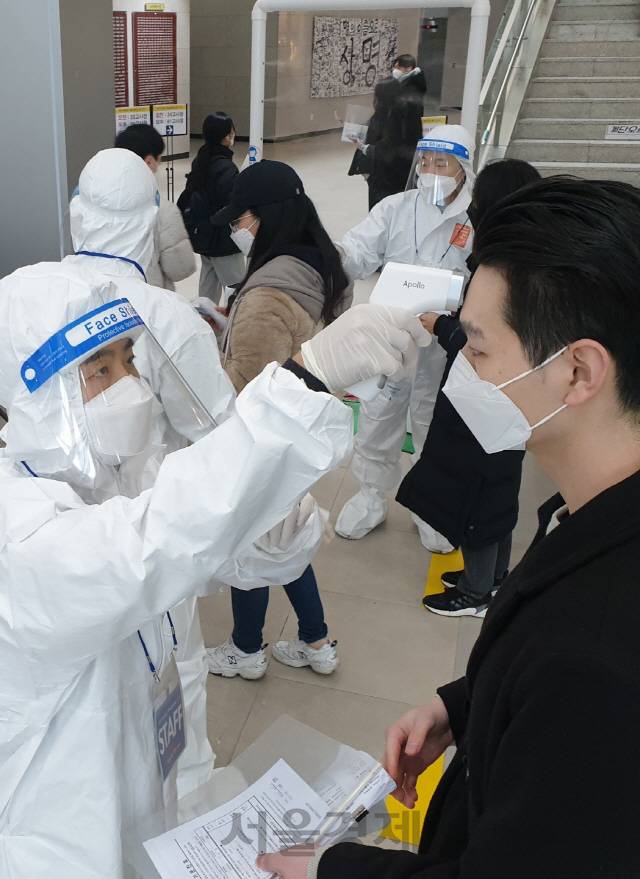[서울경제] 서울지역 대학들의 편입학 시험이 치러지고 21일 상명대학교 서울캠퍼스 미래백년관 입구에서 입실전 수험생 전원에 대해서 비접촉방식 온도계와 열화상 카메라를 이용 방역의 만전을기하고 있다./상명대학교제공 2021.01.21