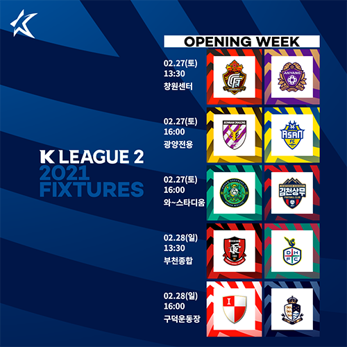 2021시즌 K리그2 첫 경기는 2월 27일 오후 1시 30분 창원 축구센터에서 열리는 경남 FC와 FC 안양의 맞대결이다.