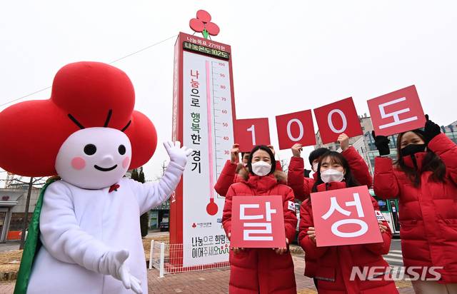 [수원=뉴시스] 김종택기자 = 21일 오후 경기도 수원시 팔달구 도청오거리에서 경기사회복지공동모금회 관계자들이 '사랑의 온도탑 100도 달성 감사 퍼포먼스'를 펼치고 있다. 경기사랑의열매는 모금액이 목포액의 100%인 277억원으로 집계됐다고 21일 밝혔다. 이는 캠페인이 시작한지 52일 만이다. 2021.01.21.