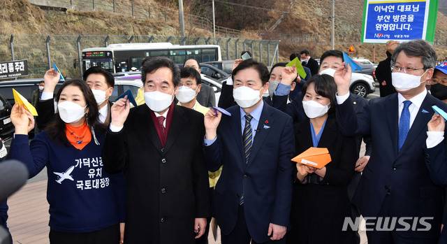 [부산=뉴시스] 하경민 기자 = 이낙연 더불어민주당 대표가 21일 오후 부산 강서구 가덕도대항전망대를 방문, 가덕신공항 건설추진 서명운동에 동참한 뒤 지지자들과 종이비행기를 날리고 있다. 2021.01.21. yulnetphoto@newsis.com