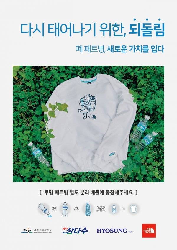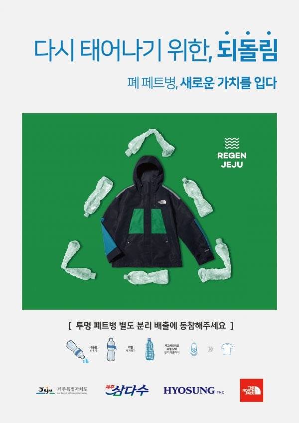 노스페이스가 이번에 참가한 ‘다시 태어나기 위한 되돌림’은 제주 지역의 자원순환 시스템을 구축하기 위한 프로젝트이다. 이번 협약을 통해 제주특별자치도와 제주삼다수(제주개발공사)는 제주에서 버려지는 국내산 페트병을 수거하고, 효성티앤씨는 페트병을 재활용해 만든 섬유이자 국내 최초로 제주 폐페트병을 재활용한 ‘리젠 제주’를 공급한다. 최종적으로 노스페이스가 이 재활용 섬유로 의류, 가방 및 용품 등 다양한 친환경 제품을 제작하게 될 예정이다.
