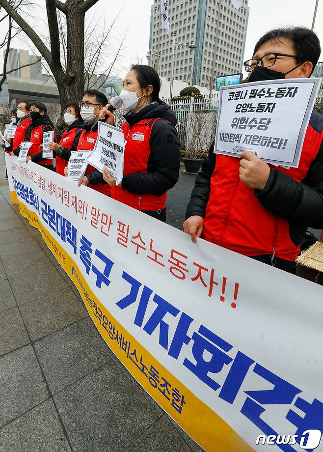 (서울=뉴스1) 안은나 기자 = 한지희 민주노총 서비스연맹 전국요양서비스노동조합 경기지부 제2조직위원장이 21일 오후 서울 종로구 정부서울청사 앞에서 열린 '재가요양보호사 근본 대책 촉구 기자회견'에서 발언하고 있다. 노조는 신종 코로나바이러스 감염증(코로나19)으로 인한 긴급생계비 지원을 전체 재가요양보호사로 지급 대상자를 확대할 것, 일회성 지원이 아닌 전체요양노동자 위험수당 10만원 지급, 근본적 대책을 위한 법안 마련을 촉구했다. 2021.1.21/뉴스1