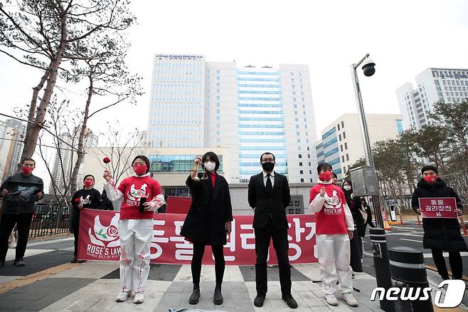 (수원=뉴스1) 조태형 기자 = 21일 오후 경기도 수원시 영통구 수원법원종합청사 앞에서 도계장 업무방해 혐의 활동가들의 항소심 선고를 앞두고 동물권리장전 회원들이 기자회견을 하고 있다. 2021.1.21/뉴스1