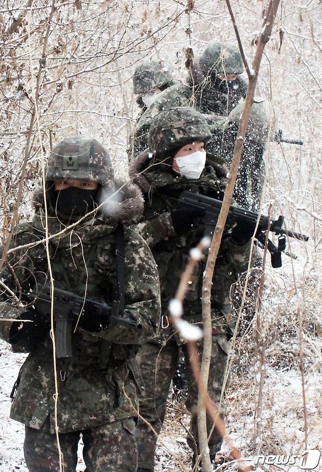 (안동=뉴스1) 최창호 기자 = 육군 제50보병사단 장병들이 21일 경북 안동시 산악지대에서 설한지 극복 훈련을 실시하고 있다. (육군 제50보병사단제공)2021.1.21/뉴스1